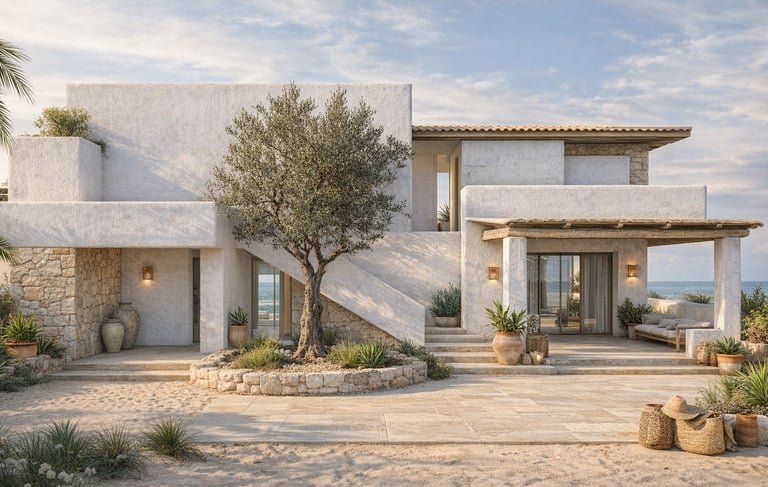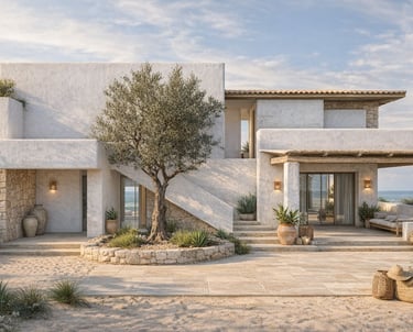 Elegant oceanfront villa featuring authentic Mediterranean architecture with white washed stucco walls, terracotta tile roofing, and expansive terraces overlooking the Pacific.